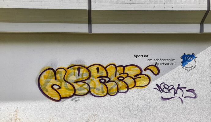Überraschung! Unser TSV Vereinslogo am Vereinsheim hat leider eine unschöne Begleitung durch eine nächtliche Graffiti-Kreation erhalten. Ein unerwartetes "Upgrade", könnte man sagen – allerdings hätten wir unsere Mitgliedsbeiträge lieber in unser Sportangebot statt in Reinigungs- und Malerarbeiten investiert.